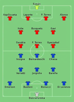 25. 1 2 3 "Tactical Line-ups – Semi-finals – Italy v Spain" (PDF). UEFA.com. Union of European Football Associations. 6 October 2021. Retrieved 6 October 2021.