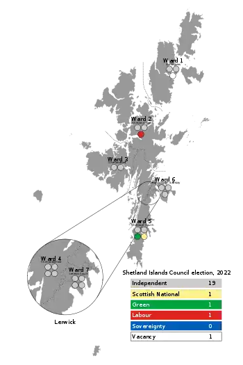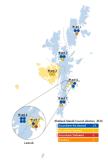 As a result, the seven existing wards were retained with realigned boundaries but the number of councillors was increased from 22 to 23. Lerwick North was renamed Lerwick North and Bressay but was otherwise unchanged, as were North Isles and Shetland North. The boundaries were adjusted in the remaining wards which resulted in Shetland Central and Shetland South being increased from three- to four-member wards and Shetland West being reduced to a dual-member ward.[5]