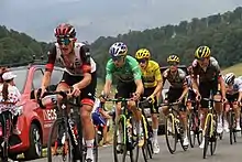 During the second week, stages 10 and 18 were disrupted by Climate Change protesters, which forced stages to be halted for a short period.[20][21][22] Media discussed the legitimacy of the protest[23] and the effect that climate change was having on the Tour,[24][25] while other coverage expressed annoyance at the disruption to the race.[26][27] The second week of the race was affected by an intense heat wave, with several stages having temperatures of around 40 °C (104 °F).[25][28] Some riders suffered heat stroke including Alexis Vuillermoz on stage 9.[29]