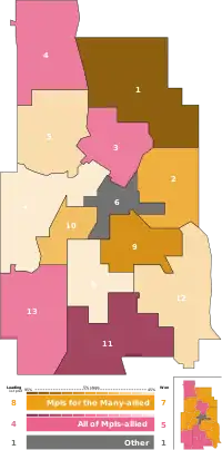 All incumbents were re-elected. The closest race was in ward 8, where incumbent council president Andrea Jenkins defeated her challenger Soren Stevenson by just 38 votes. Despite this narrow victory, a coalition of progressive members managed to secure a majority with seven of the thirteen seats. This coalition, powered by a combination of local Democratic Socialists of America (DSA) support and the allied PAC Mpls for the Many,[4] achieved success despite being financially outpaced by groups like All for Mpls[5] who supported mayor Jacob Frey. Despite their majority, progressives are two votes short of overriding a veto by Frey.[6] Discussions on rent control remain stalled, police reform is under scrutiny amidst a state consent decree, and homelessness remains a pressing concern.[7]