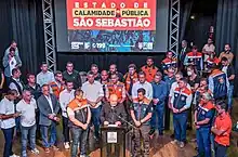 Governor Tarcísio de Freitas declared a state of emergency for 5 cities on 20 February.[8] A 180-day "state of calamity" was subsequently declared for São Paulo.[12] That day, Brazilian President Luiz Inácio Lula da Silva toured the affected areas and stated that São Sebastião would be rebuilt in safer areas. He advised those living on the hillsides to move to other locations.[2][6] On 22 February, the NAM Atlântico set sail from the Rio de Janeiro Navy Arsenal with a field hospital on board, with a capacity that could be increased to up to 300 beds.[2][13] The vessel arrived at the port of São Sebastião on 23 February, also carrying 28 medics of several specialties including surgeons, dentists and orthopedists, as well as 180 marines who were designated to operate heavy machinery in aid of the search and rescue efforts.[14]