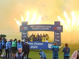 The 2023 Women's Ashes series (officially the Metro Bank Women's Ashes Series for sponsorship reasons)[1] was a cricket series which took place in England in June and July 2023 as the 2023 edition of the Women's Ashes.[2] For the series, England and Australia faced each other in one Test, three One Day International (ODI) and three Twenty20 International (T20I) matches.[3] The ODI series formed part of the 2022–2025 ICC Women's Championship tournament.[4] A points-based system was used across all three formats of the tour to determine the winner of the Ashes series.[5] The Test match at Trent Bridge was the first ever women's Test in England and second overall to be scheduled for five days of play.[6][7] Australia were the defending champions, having won the 2021–22 Women's Ashes series 12–4.[8][9]
