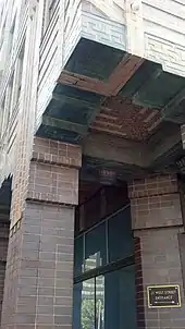 The arches of the arcade are mostly laid in stepped brickwork. On the Morris Street elevation, the fifth bay from the east is a square marble-framed arch that leads to the main entrance. The spandrels above the arcade are textured in a chevron (V-shaped) design with tan and purple brick.[11][12] There are numerous storefronts beneath the arcade, as well as the entrance to the building's lobby.[11] The arcade, storefronts, and main entrance contain decorative metalwork painted in silver and gold tones, which extend into the interior.[16][21] The metalwork was described by the National Park Service as "an unusual design feature".[16] The piers and interior walls of the arcade are outfitted with bronze panels and lighting installations. The ceiling of the arcade has multicolored and patterned mosaics.[11][12][21]
