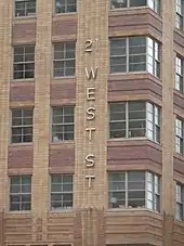 21 West Street is 31 stories tall.[lower-alpha 2] It was designed in the Art Deco style by Starrett & van Vleck, who simultaneously designed the adjacent Downtown Athletic Club building in the same style.[5][6] The two buildings were constructed for different purposes and accordingly have different appearances; namely, the facade of 21 West Street is lighter in color than that of the Downtown Athletic Club.[5] Starrett & van Vleck had already designed several New York City department stores, including the Lord & Taylor, Bloomingdale's, and Saks Fifth Avenue buildings.[13][14] Architectural historian Anthony W. Robins described 21 West Street as "one of the area's handsome Art Deco towers".[14]