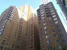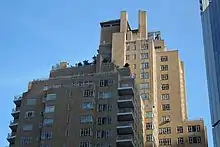 240 Central Park South occupies about half of its land lot.[13][24][25] The building is largely C-shaped in form and contains two primary sections, a 28-story section on Central Park South and a 15-story section on 58th Street, connected by the lobby running along Broadway.[13][24] Atop the main roofs of each apartment block are placed chimneys and water towers.[26][16][27] 240 Central Park South is variously quoted as having either 325,[24] 326,[16][27] or 327 apartments across its two apartment blocks.[28][lower-alpha 2]