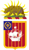 The shield is red for Artillery. The six pallets couped produce a diminished bordure effect on the shield and represent the six batteries comprising the Regiment at the time of its organization. The ship is a representation of the ship of Don Juan Rodrigues Cabrillo, a Portuguese, who discovered San Diego Harbor. The charges on the canton, the fleur-de-lis encircled by a garland of laurel, are taken from the coat of arms of the 250th Coast Artillery, as Batter B of the 251st Coast Artillery, California National Guard, is a descendant of Batter F of the 250th Coast Artillery, California National Guard which served during World War I as B Battery of the 65th Coast Artillery (US).