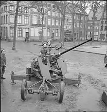 50th (Northumbrian) Division was relieved on 5 August, but was back in action on 9 August, attacking against stiff opposition in the advance beyond Mont Pincon as the Allies closed the Falaise Gap.[67] Once the Seine was crossed and the pursuit began, 50th (N) Division supported 11th Armoured Division's rapid advance, protecting the flank and 'mopping up' local resistance. On 1 September the division secured bridges over the River Somme near Amiens and reached Arras. The AA brigades accompanying 21st Army Group quickly followed up to provided cover for these bridges, while 25th LAA Rgt was able to continue the advance with its division, which took part in the Liberation of Brussels on 3 September.[68][69][70][71][72]