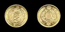 Japan officially went onto the gold standard in 1897 from reserves obtained after the first Sino-Japanese War.[3][5] New laws were passed that abolished the Japanese silver trade dollar, as well as the one silver yen piece. The two yen gold coin was also not among the new coins scheduled to be minted.[3] Two yen gold coins were finally abolished as legal tender in 1988, by this time the exchange rate for gold coins to Japan's modern circulating currency as a whole was zero.[6]