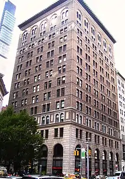 The 16-story Beaux-Arts style building was to a design by Starrett & van Vleck.[2] Built in 1911 for Mills & Gibb on the site of the old Fourth Avenue Presbyterian Church,[3] it boasted a frontage of 114 feet (35 m) on Fourth Avenue and 100 feet (30 m) on Twenty-second Street.[2] The Beaux-Arts style building was completed in 1911. Its automatic sprinklers were supplied with water by two steel pressure tanks of 9,000 US gallons (34,000 L; 7,500 imp gal) capacity each, located in a fireproof house on the roof. They were connected together, with gate and check valves at each, and discharge through a dead riser running down through the building to the basement. The ornamental iron partitions glazed with wire mesh glass that separated each floor from the main stairway were furnished by the Winslow Brothers' Company. "Richardson" seamless kalamein fire doors protected the openings on the passenger elevator shaft. furnished by the J. F. Blanchard Company, these doors were finished with Verdi antique enamel. The entire steel frame was fireproofed with terra cotta hollow tile furnished by Henry Maurer & Son, New York City.[4]