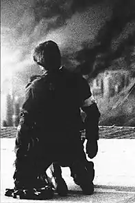 There was a scene cut from "33" where we saw Laura being given her copy of the photo along with a card that said it was taken on the roof of the capitol building on Aerilon during the attack. The photo was inspired by the famous shot of the fire-fighters raising the flag at Ground Zero that became iconic. I thought the Colonies would have their own version of this—a snapshot taken in the moment that becomes a symbol of the day they can never forget and of all they had lost. The photo itself is of a soldier falling to his knees (possibly shot or simply overcome by emotion) as he stands on the rooftop over looking the devastation of his city, while the Colonial flag waves at the edge of frame. The inscription below the photo on Laura's plaque reads, "Lest We Forget" in itself a reference to the inscription on the watch presented to John Wayne's character in She Wore a Yellow Ribbon.