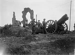 Reserve Army now took over this sector of the front, and X Corps continued attacking south of the Ancre, including the fighting round Ovillers, supported by 41st Siege Bty. On 14 July a party unloading ammunition at RX's position were caught by a single German 'Five-Nine' shell:[lower-alpha 1] one officer and 12 Other Ranks (ORs) of the battery were killed or died of wounds and another seven ORs wounded, as well as casualties among the Army Service Corps and an infantry working party. Another unlucky shell on 17 July caught RX's billet at lunch time, resulting in another man dead and 15 wounded.[4][20][26][27][28]