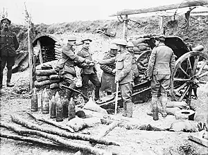 57th (H) Battery (with a section of the BAC) was permanently transferred to 8th Division on 23 June 1915, leaving XLIII (H) Bde with just two batteries, which was now the standard establishment for the BEF's howitzer brigades.[3][27][28][30][29][47][67] The Canadian Division moved away on 24 June and XLIII (H) Bde went to rest billets at Ferfay. At the end of the month 40th (H) Bty went to Vermelles where it rejoined 1st DA for the first time since February. It spent the following weeks in 1st Division's Sector Y, exchanging retaliatory fire with Germans in Auchy-les-Mines and Hulluch, north of Loos-en-Gohelle. 30th (H) Battery moved up and began preparing positions on 13 July to support 1st Division's Sector Z. From 20 July a section of each battery was relieved by a section from LXXIII (H) Bde, a New Army ('Kitchener's Army') unit just arrived in France with 15th (Scottish) Division. The newcomers were introduced to trench warfare until 5 August. The front remained quiet, with just a few shells fired each day.[29][66][68]
