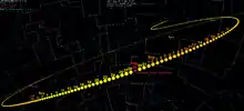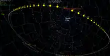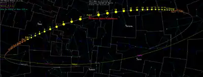 This shows the path of the comet during August 2011, with daily motion drawn as spheres, scaled for relative distance from earth.