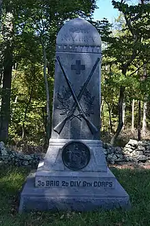 Of note, the 49th New York Volunteer Infantry Regiment, commanded by COL Bidwell, brought 414 men into action, but lost only two enlisted men wounded. This was because Neill's 3rd Brigade of VI Corps was one of the last to reach the battlefield on Thursday, July 2, and was held in reserve on the Baltimore Pike at Rock Creek. On Friday, the third day of the battle, the brigade deployed to the north of the Pike on the east side of Rock Creek to push back Confederate skirmishers that were threatening the army's main supply and communications route. It advanced to where its monument is now located, taking light casualties.[13]