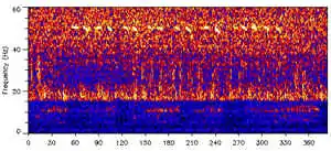 The sonic signature is that of a whale, albeit at a unique frequency. The call patterns resemble neither blue nor fin whales, being much higher in frequency, shorter, and more frequent.[5] Blue whales usually vocalize at 10–39 Hz,[2] fin whales at 20 Hz.[1] The calls of this whale are highly variable in their pattern of repetition, duration, and sequence, although they are easily identifiable due to their frequency and characteristic clustering.[6] The calls have deepened slightly to around 50 hertz since 1992, suggesting the whale has grown or matured.[4]
