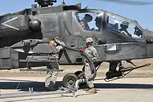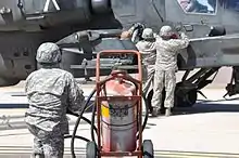 Soldiers connect the fuel hose to an AH-64 Apache.