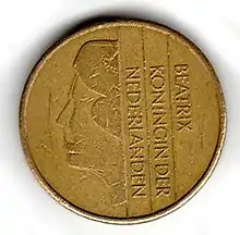 The Dutch Five guilder coin was the highest-denomination coin in the Netherlands from its introduction in 1988 until the adoption of the euro in 2002. Its nominal value was ƒ 5,- (€ 2.27).