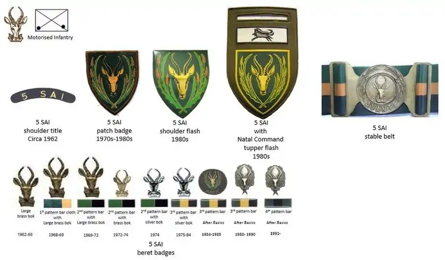 5 SAI was established on 1 January 1962, at Ladysmith, Natal Province.[1] The battalion became operational on 1 April 1962.[1]