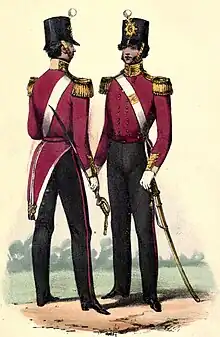 The regiment returned from India in November 1826.[14] It embarked for Gibraltar in 1832 and moved on to the West Indies in 1833: it was initially based at Saint Kitts but moved to Demerara in 1837 and to Barbados in 1839 before returning home in 1840.[15] It embarked for India in 1858 and them moved on the China in 1860 for service in the Second Opium War.[16] It saw action in the Battle of the Taku Forts in August 1860 and the Battle of Palikao in September 1860 before taking part in the capture of Peking later that month.[16] The regiment moved to Japan in 1864 and to South Africa in 1865 before returning home in 1866.[16]