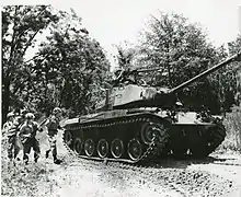 Guardsmen of Troop B, 1st Reconnaissance Squadron, 108th Cavalry maneuver with an M41 Walker Bulldog tank, Fort Stewart, July 1961