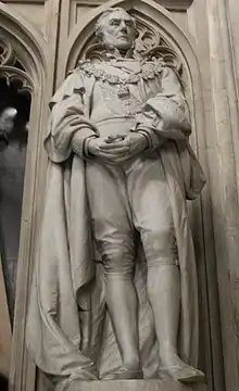 Although he was offered a burial at Westminster Abbey, Shaftesbury wished to be buried at St. Giles. George Williams (YMCA) chaired the organising committee of his funeral, and was a pall-bearer at it.[55] A funeral service was held in Westminster Abbey during the early morning of 8 October and the streets along the route from Grosvenor Square and Westminster Abbey were thronged with poor people, costermongers, flower-girls, boot-blacks, crossing-sweepers, factory-hands and similar workers who waited for hours to see Shaftesbury's coffin as it passed by. Due to his constant advocacy for the better treatment of the working classes, Shaftesbury became known as the "Poor Man's Earl".[3] A white marble statue commemorates Shaftesbury near the west door of Westminster Abbey.[56]