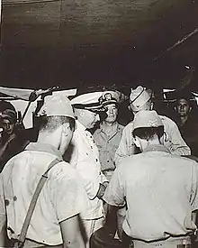 RADM Marshall Greer, USN, accepts the surrender of 2nd Lt Kinichi Yamada aboard CGC 83525