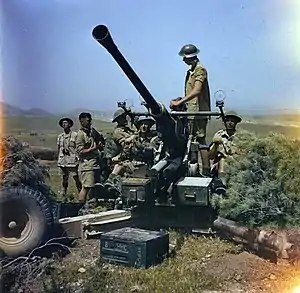 105th LAA Regiment was assigned to 66th AA Bde for the Italian Campaign. The brigade arrived in late 1943, and its first assignments were to protect the area round Salerno, where some of the initial landings had been made, and the airfields supporting the operations of US Fifth Army up the west side of Italy. As well as 105th LAA Rgt and two HAA regiments, the brigade included three US battalions equipped with Bofors guns. Further additions to its strength were made by January 1944.[6][19][20]