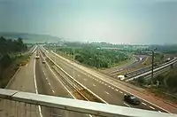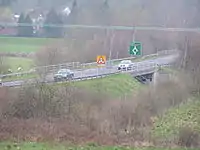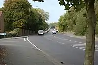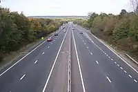 Between 1988 and 2017, the Tonbridge bypass and the Pembury bypass were separated by a 1.7 miles (2.7 km) section of 7.3m wide single carriageway with no footways or verges. Severe congestion was frequent[13] as this stretch carried an average of 35,000 vehicles each day, significantly higher than its original capacity, and the number of accidents occurring on this road was above the national average. There were proposals to upgrade this section of A21 to a dual carriageway standard following the Pembury bypasses completion, however they were delayed multiple times.[14][15] In the 2000s, an upgrade scheme was proposed by the Highways Agency, and in 2013 it underwent public enquiry.[16] The scheme layout followed the existing carriageway and involved the construction of a pedestrian and cycle route along its whole length, as well as upgrading the Longfield Road roundabout into a grade-separated Roundabout interchange. £92million of government money was made available to the scheme in July 2013.[17] Preparatory works started in September 2014,[18] which involved nine hectares of ancient woodland being removed. Trees and shrubs were relocated to adjacent land and nesting boxes were installed to protect endangered species such as the dormouse. As a result of the widening of the carriageway a number of buildings were demolished, including a Grade 2 listed 18th century barn. Completion of the scheme was delayed in late 2016 after the discovery of asbestos contamination.[19] The improved road opened in September 2017.[20]