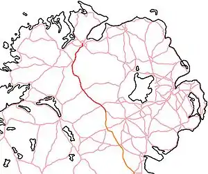 The route of the A5 in red linking Derry city and Aughnacloy, County Tyrone). The continuation of this route in the Republic of Ireland, the N2, is shown in orange.