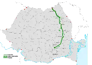 Initially it was designed as a 314 km (195 mi) long motorway branching off the A3 motorway and passing through Buzău, Focșani, and Albița, to the border with the Republic of Moldova. However, since 2014 plans in favor of a motorway past Focșani were scrapped in favor of a motorway towards Bacău, Suceava, and Siret termed A7.[6] The motorway from Focșani to Albița (155 km)[7] will have a different route number assigned and, as of April 2014, it was no longer a priority in the master plan for the national motorway network.[8]