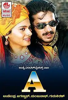 A is an 1998 Indian Kannada-language romantic psychological thriller film written and directed by Upendra. It stars Upendra in his acting debut and Chandini in the lead roles.[2] The film revolves around a love story between a film director and an actress which is narrated through multiple flashbacks within flashbacks and reverse screenplay. It also explores about the dark truths like casting couch in the film industry. The soundtrack and background score were handled by Gurukiran in his debut film.[3]