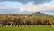 According to legend, Joseph of Arimathea visited Glastonbury with the Holy Grail and thrust his staff into Wearyall Hill, which then grew into the original thorn tree.[97][98] The original tree has been propagated several times, with one tree growing at Glastonbury Abbey and another in the churchyard of the Church of St John. The "original" Glastonbury thorn was cut down and burned as a relic of superstition during the English Civil War, and one was planted on Wearyall Hill in 1951 to replace it.[99]
