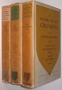 A History of the Crusades by Steven Runciman, published in three volumes during 1951–1954 (vol. I - The First Crusade and the Foundation of the Kingdom of Jerusalem; vol. II - The Kingdom of Jerusalem and the Frankish East, 1100-1187; vol. III - The Kingdom of Accre and the Later Crusades), is an influential work in the historiography of the Crusades, including the events that led up to these expeditions to the Holy Land and an extensive study of primary sources.