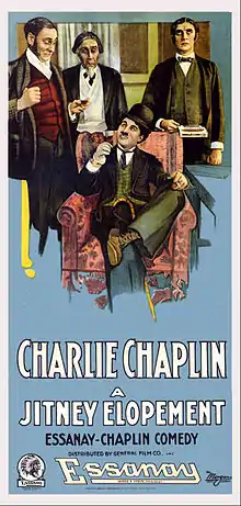 A Jitney Elopement was Charlie Chaplin's fifth film for Essanay Films. It starred Chaplin and Edna Purviance as lovers, with Purviance wanting Chaplin to take her away from an arranged marriage her father (played by Fred Goodwins) had planned for her. Chaplin does take her away in a jitney, a type of share taxi popular in the US between 1914 and 1916. Most of the film was made in San Francisco and includes scenes of San Francisco's Golden Gate Park and the large windmills still on the park's west side.