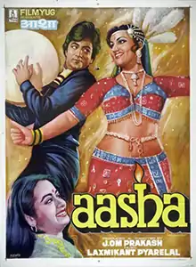 Aasha (transl.Hope) is a 1980 Indian Hindi-language drama film, produced and directed by J. Om Prakash under the Filmyug Pvt. Ltd. banner. It stars Jeetendra, Reena Roy, Rameshwari and music composed by Laxmikant Pyarelal. The film is recorded as a "Blockbuster" at the box office.[1] It was remade in Telugu as Anuraga Devatha (1982), in Tamil as Sumangali (1983)[2] and in Bengali as Mandira (1990).