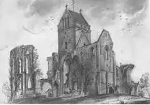 Gerville notes that in 1825 "the demolition of buildings is advanced."[7] In 1831, demolition continued, as mentioned by the English antiquarian Henry Gally Knight. In 1832 Mother Marie-Madeleine Postel (later canonised) was able to buy the abbey ruins that she wanted to make the parent of the congregation that she had founded in Cherbourg. There then remained only two small low houses to the left of the church and the entrance porch and the lower part of a building that had served as a cellar and storeroom.