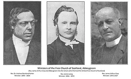 | 1900 | Rev. James Arthur Gray | Abbeygreen joins the United Presbyterian Church along with the majority of the Free Church of Scotland at the formation of the United Free Church of Scotland | |