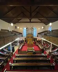 After completion of the building, the congregation of Abbeygreen immediately organized Sabbath day (Sunday) and regular Schools with supporting libraries,[98] and built the church manse[99][83] later in 1844. A Free Church School was built on Peasehill,[100][83] Lesmahagow, in 1851. The church also established a number of mission stations in the local area resulting in the planting of a number of congregations which then developed within the Free Church of Scotland. The church in the neighbouring village of Coalburn[101][102][103] was one such mission station established in 1893, becoming an independent Free Church congregation in November 1895[104] with Rev. Peter Walker[105] who ministered there until 1934. Additionally, Free Church congregations were established in the villages of Douglas,[106][107][108] (with the church being built in 1845),[109] and Rigside/Douglas Water,[110][111][112][113] (with the church being built in 1886).[58] Each of these resulted, at least in part, from the open air preaching ministry during the summer of 1843 and following.