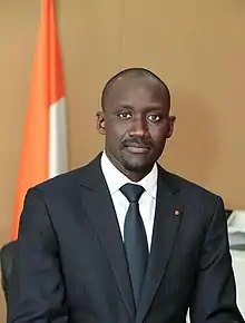 On November 19, 2013, he was appointed Minister in charge of the Budget and the State Portfolio, becoming the youngest minister in Daniel Kablan Duncan's government.[11][12] In this capacity, he oversees the drafting and execution of the State Budget; directs the implementation of the Government's budget, customs and fiscal policy; and manages State participations and Public Enterprises. He also contributes to the identification and management of the country's economic policy and debt guiding priorities. As such, and under the guidance of Prime Minister Daniel Kablan Duncan, he drives a vast program of reforms aimed at improving the management of public finances.[13][14] This includes such initiatives as the electronic land register (LIFE), the new decree governing procurement timelines, the creation of two test centers dedicated to the management of medium-sized businesses (CME), the launching of mixed fiscal and customs controls; as well as the linking of the Tax Office and Customs Department that allowed for the reclassification of certain taxpayers and put an end to the manual registration of taxpayer identification numbers at the Customs Department.