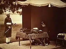 Five days later, the Queen noted that "The Indians always wait now and do so, so well and quietly."[15] On 3 August, she wrote: "I am learning a few words of Hindustani to speak to my servants. It is a great interest to me for both the language and the people, I have naturally never come into real contact with before."[16] On 20 August she had some "excellent curry" made by one of the servants.[17] By 30 August Karim was teaching her Urdu,[18] which she used during an audience in December to greet the Maharani Chimnabai of Baroda.[19]