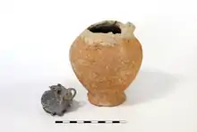 Remains of Iron Age I have been revealed mainly in Area A on the eastern edge of the saddle between the lower and upper mounds, where five strata belonging to this period have been excavated, as well as in Area F. In both areas, the pottery included many collared-rim jars, wavy band pithoi, small hemispherical bowls, a variety of vertical cooking pot rims, pyxides, painted carinated kraters, and pear-shaped jugs.