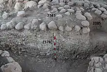 The rampart layers, capped by small-medium stones, looking north; Iron I pits and stone silos cut into the layers