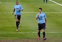 Hernández (left) and Luis Suárez celebrating a goal against the Netherlands in June 2011