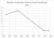 Between 1982 and 1992, the number of abortion clinics in the state increased by three, going from fifteen in 1982 to eighteen in 1992.[33] In 2014, there were three abortion clinics in the state.[34] In 2014, 93% of the counties in the state did not have an abortion clinic. That year, 71% of women in the state aged 15–44 lived in a county without an abortion clinic.[35] In 2017, there were two Planned Parenthood clinics, one of which offered abortion services, in a state with a population of 1,112,199 women aged 15–49.[36] In 2018, there were three licensed abortion clinics in the state. They were in Charleston, Columbia and Greenville.[8] The Charleston clinic was a Planned Parenthood clinic in West Ashley.[8]
