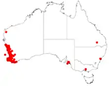 The species is distributed throughout the west coast Western Australia from north of Geraldton to south around Albany. It grows in a variety of soils types in areas near streams, rocky hills, salt pans and clay flats.[1]
