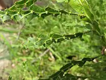 The phyllodes (modified petioles) are reduced in size and give the impression of cladodes (branches that resemble leaves). The wings of these phyllodes are usually 2 to 20 millimetres (0.08 to 0.79 in) wide and 5 to 70 mm (0.20 to 2.76 in) long. Furthermore, each phyllode extends into a spine. Tolerate frosts to −7 °C (19 °F).[2]