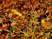 The low spreading, viscid shrub typically grows to a height of 0.2 to 1 metre (1 to 3 ft).[2] The obscurely ribbed branches normally spread horizontally giving the shrub a flat-topped appearance. The green to grey-green phyllodes are solitary or sometimes in clusters of two or three at the nodes. Each phyllode is 2 to 7 centimetres (0.8 to 2.8 in) in length and has a diameter of about 1 millimetre (0.04 in) and are straight or curve shallowly upward.[1] It blooms from March to October producing golden yellow flowers.[2] The simple inflorescences have an erect flower spike that is 10 to 45 mm (0.4 to 1.8 in) in length. Following flowering flat, thick and linear dark brown seed pods with a length of 2 to 8 cm (0.8 to 3.1 in) and a width of 2 to 6 mm (0.08 to 0.24 in). The erect and woody pods are sticky with resin and have an odour resembling like citronella or lemon grass. The ellipsoidal dull to slightly shiny brown seeds are 3 to 5.5 mm (0.12 to 0.22 in) long.[1]