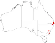 It is endemic to south eastern parts of Queensland and north eastern parts of New South Wales where it is often found along the margins of rainforest communities.[2]