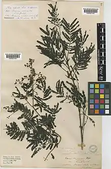 The shrub or tree has an erect habit and typically grows to a height of 2 to 12 m (6 ft 7 in to 39 ft 4 in) and has grey, green or brown coloured bark with a smooth or slightly fissured texture. The angled to terete branchlets have fine yellowish brown to white hairs found on the ridges. The filiform leaves have a 2.5 to 12 cm (0.98 to 4.72 in) long rachis with 7 to 27 pairs of pinnae with a length of 1 to 4.7 cm (0.39 to 1.85 in) that are, in turn, composed of 14 to 51 pairs of glabrous pinnules with an oblong to narrowly oblong shape that are 1 to 3 mm (0.039 to 0.118 in) in length and 0.5 to 0.7 mm (0.020 to 0.028 in) wide.[1] It flowers throughout the year and produces yellow flowers. The simple inflorescences are located in the axillary racemes and have spherical-flower-heads that contain 12 to 25 pale yellow or cream-coloured flowers. After flowering coriaceous and brownish black to bluish-black seed pods form that usually have a curved shape with a length of 3 to 14 cm (1.2 to 5.5 in) and have a width of 7 to 12 mm (0.28 to 0.47 in).[2]