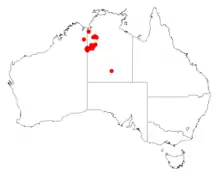 It is native to an area in the Northern Territory and Kimberley region of Western Australia where it found growing in sandy soils over sandstone.[1] The range of the plant extends from the far easter Kimberley in the west to the upper area of the Victoria River near Winnecke Creek and near Gardiner Range in the northern Territory where it is often a part of shrubland or woodland communities.[2]